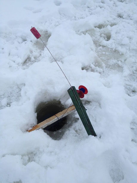 kommer, mitt spö, längst bort som vanligt. Jag väntar ut linan och brassar på ett mothugg, men det förväntade tunggunget uteblir, istället förmedlar spöet ettriga små knyckar. Attans småfisk, men jag såg stjärtfenan på min stormört långt nere i svalget på den, så den kanske växer till sig till nästa gång. Ja ja, på med ny pigg mört och back to base camp. Men sedan händer inte så mycket, vi har enligt vår egen mening försåtsminerat alla relevanta ytor med mört, från den absoluta vasskanten ut över kanter och djupkurvor ned mot 5-6meter. Platsen är garanterat potent, men just idag tycks det som att det är halvfart under isen. En pimpelklubb råkar ha tävling på samma vatten och efter några förhör framkommer att även borrarna tjurar å det grövsta.