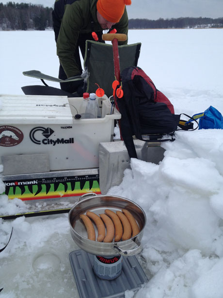 Micke får ett fäll och krokar en fisk som inte heller den är något att skriva hem om. Även om den i ärlighetens namn var storleken större än min. Efter att ha förflyttat oss några hack utåt bestämmer vi oss för att hålla på vår plan och göra en längre förflyttning medelst bil efter lunch. Lunchen intogs för övrigt i bästa stil, Krakowkorv kokad på gasköket, världsklass.