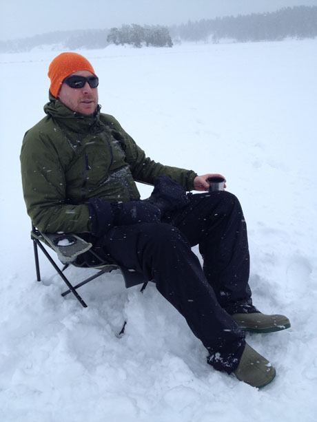Efter lunchen river vi allt och traskar tillbaka till bilarna över en ganska tunggådd is. Mycket blött var det, och varje steg sjönk igenom snön ned i ett 10 cm slasklager. Väl framme på nya stället, samma “vik” men en halvmil längre ut, noterar vi att det även här är fullt med folk på isen. Förutom lite cross-och fyrhjulingsåkare noterar vi ett gäng som ser ut som fiskare som drar runt en jättepulka långa sträckor från kant till kant och ut till alla öar. Sedermera upptäcker vi att dom sätter ut angeldon. Den värsta sorten dessutom, stumknutna runt reglar som ligger tvärs över hålen. De sätter ut 10-15 st runt alla öar och fyller på längs heta kanter. Säkert satte dom totalt ut 50 st eller fler. Och därefter gick dom hem. Vidrig form av fiske :( I morgon, eller när fan dom nu vaknat ur groggdimman, lallar dom väl runt och plockar upp grejerna igen, med ett sannolikt antal stela gäddlik fast på många don.